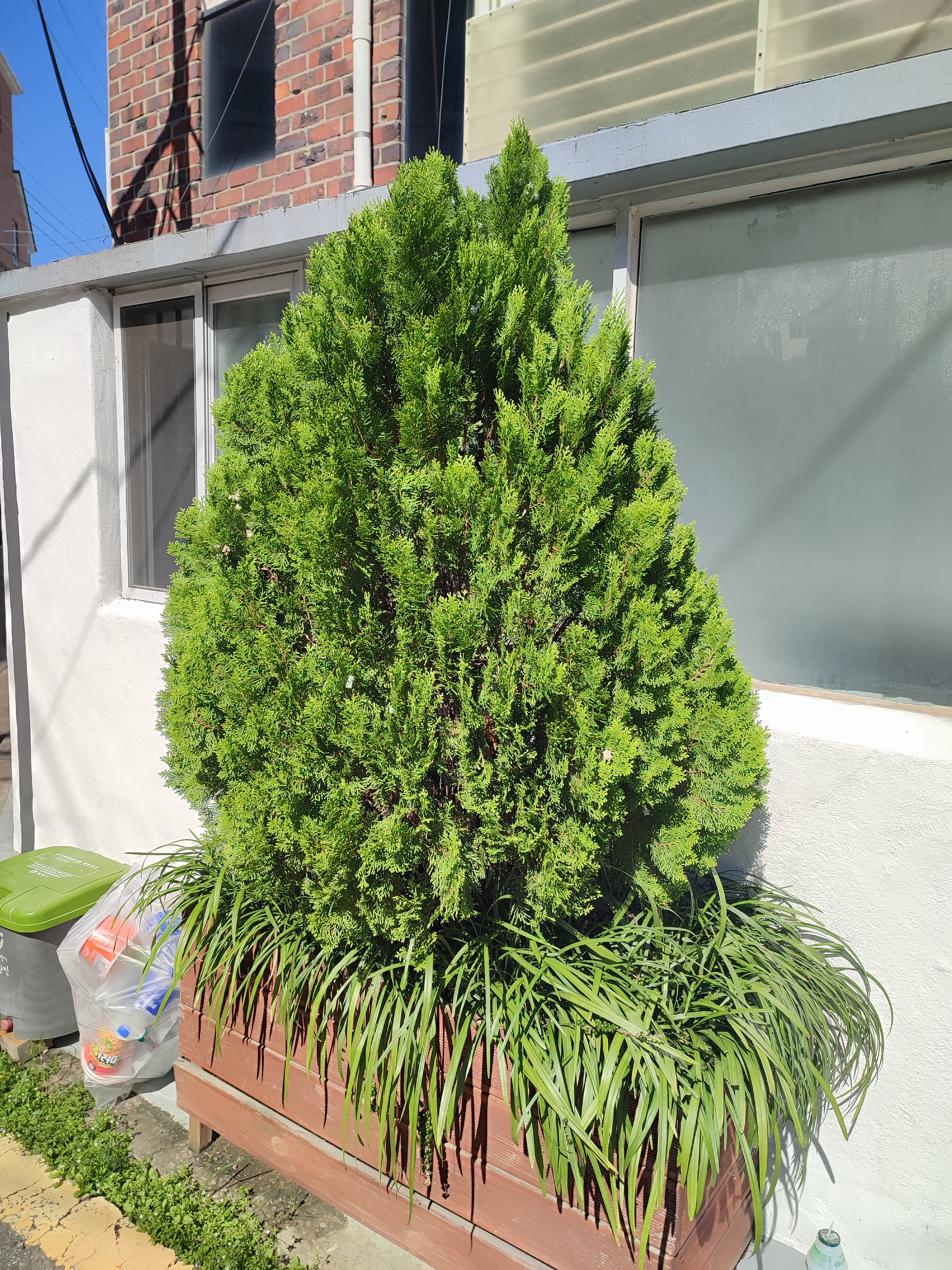 그래서 넓은 화분이 권장되는데요. 아래 사진의 화분은 가로로 넓은편인데 꽤나 큰 황금측백이 자라고 있어요.