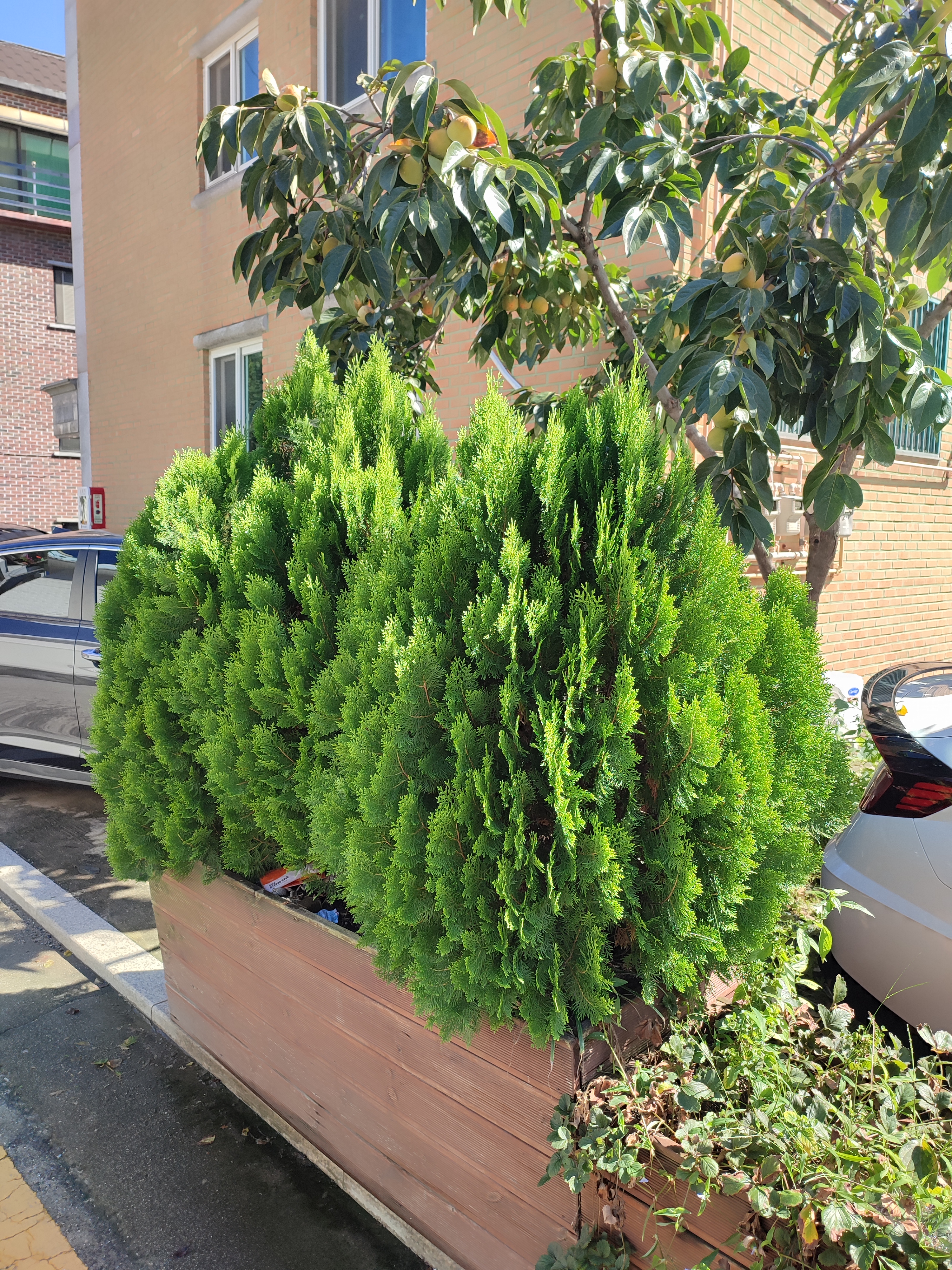 측백나무가 겨울 건조한 바람에 약한데, 여긴 벽으로 뒤가 막혀있어서 바람 영향도 적은 것 같아요.