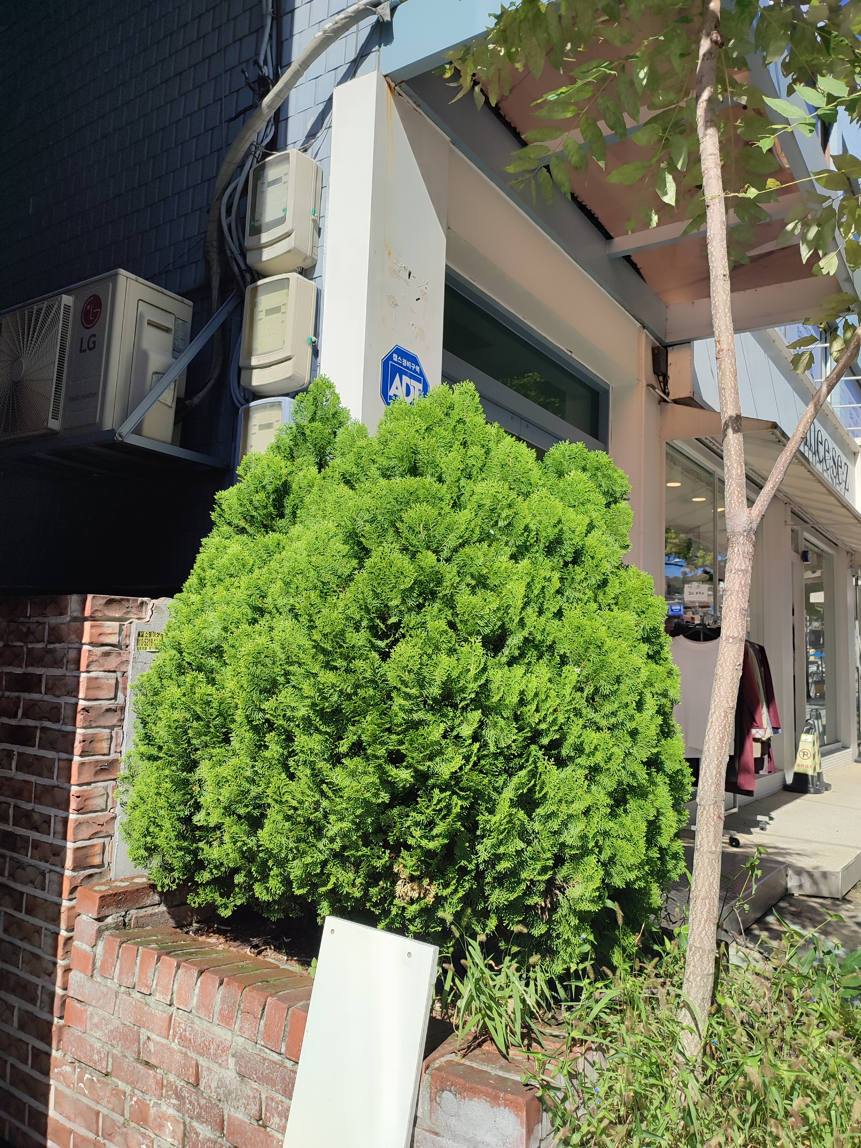 집 근처 버스정류장 옆 건물에도 황금측백이 있어요.