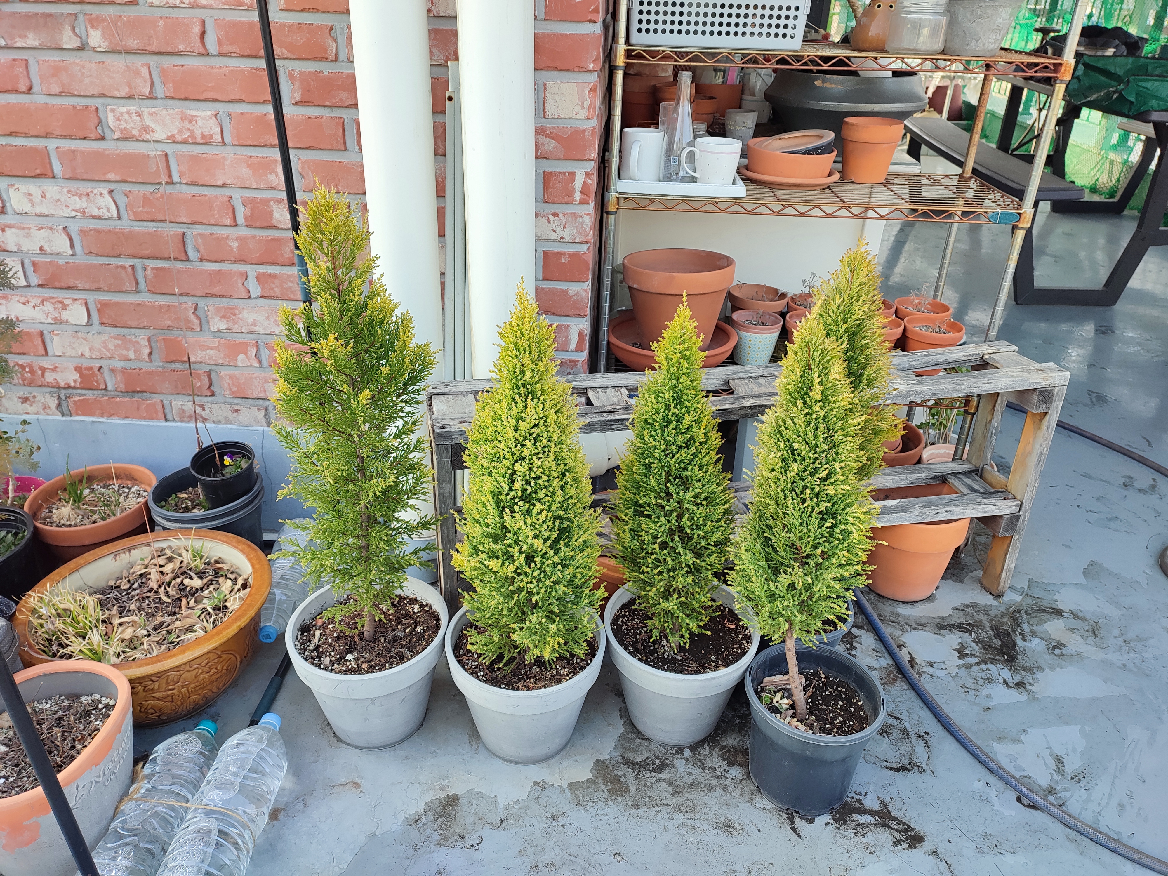 옥상에 작은 측백나무들 화분이 많아요. #블루엔젤 #골든스마라그 #써니스마라그 #허리케인