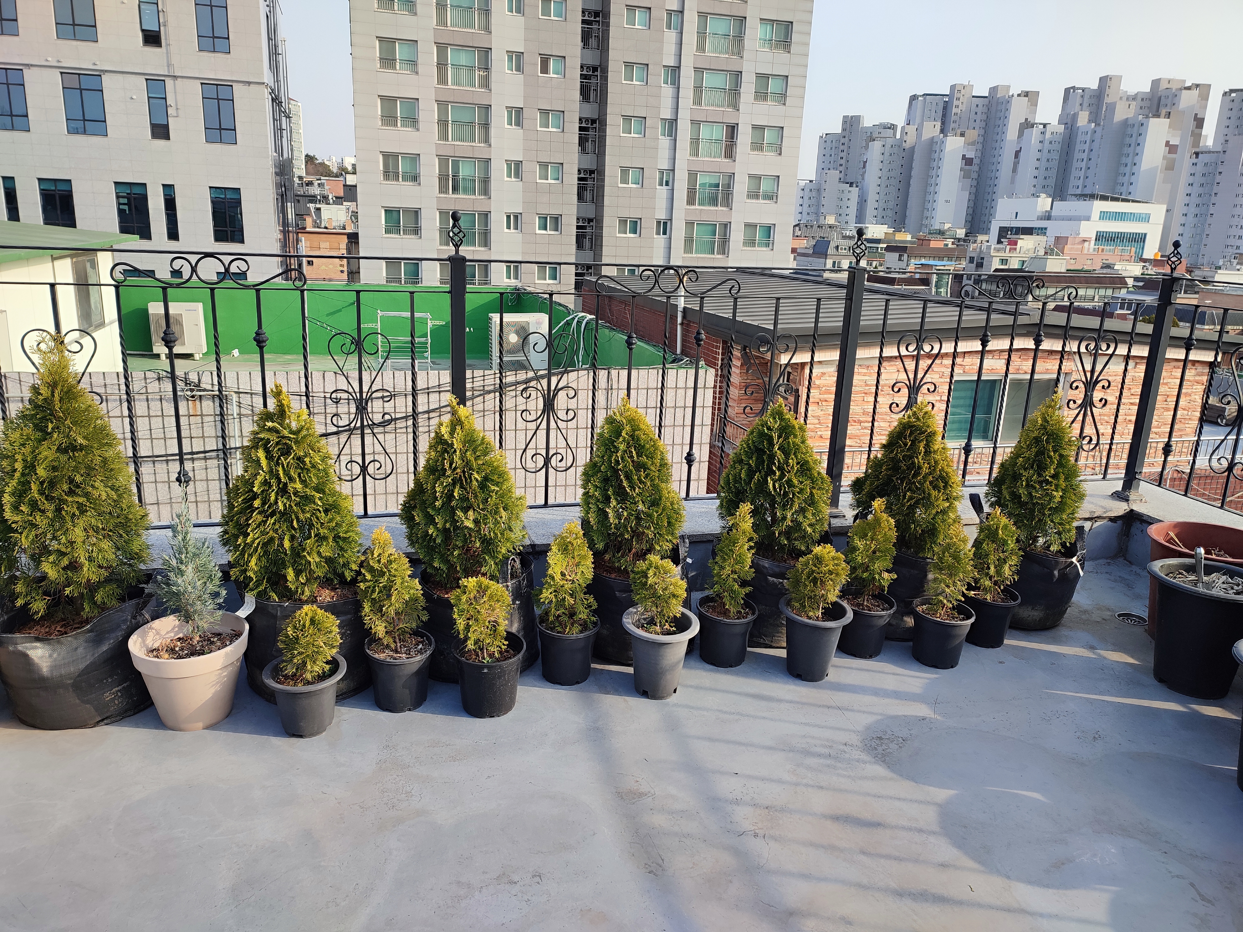 평소엔 옥상 정원의 화분들을 옥상 테두리를 따라 배치해두는데요. 작년 여름에 너무 더워서 측백나무들이 ...